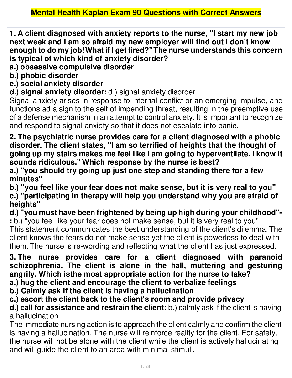 Mental Health Kaplan Exam 90 Questions with Correct Answers Kaplan Mental Health B (2022) QUESTIONS AND ANSWERS ALL CORRECT Kaplan Psych STUDY GUIDE QUESTIONS AND ANSWERS (ALL CORRECT) UPDATED 2...