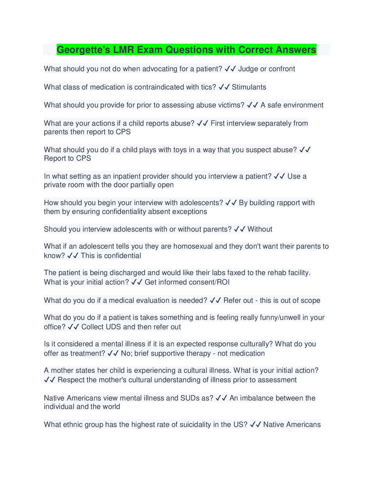 Georgette's LMR Exam Questions with Correct Answers ANCC Georgette Review for Boards Exam Questions with Correct Answers Georgette Review Exam Questions with Correct Answers Domain I-II - Geo...