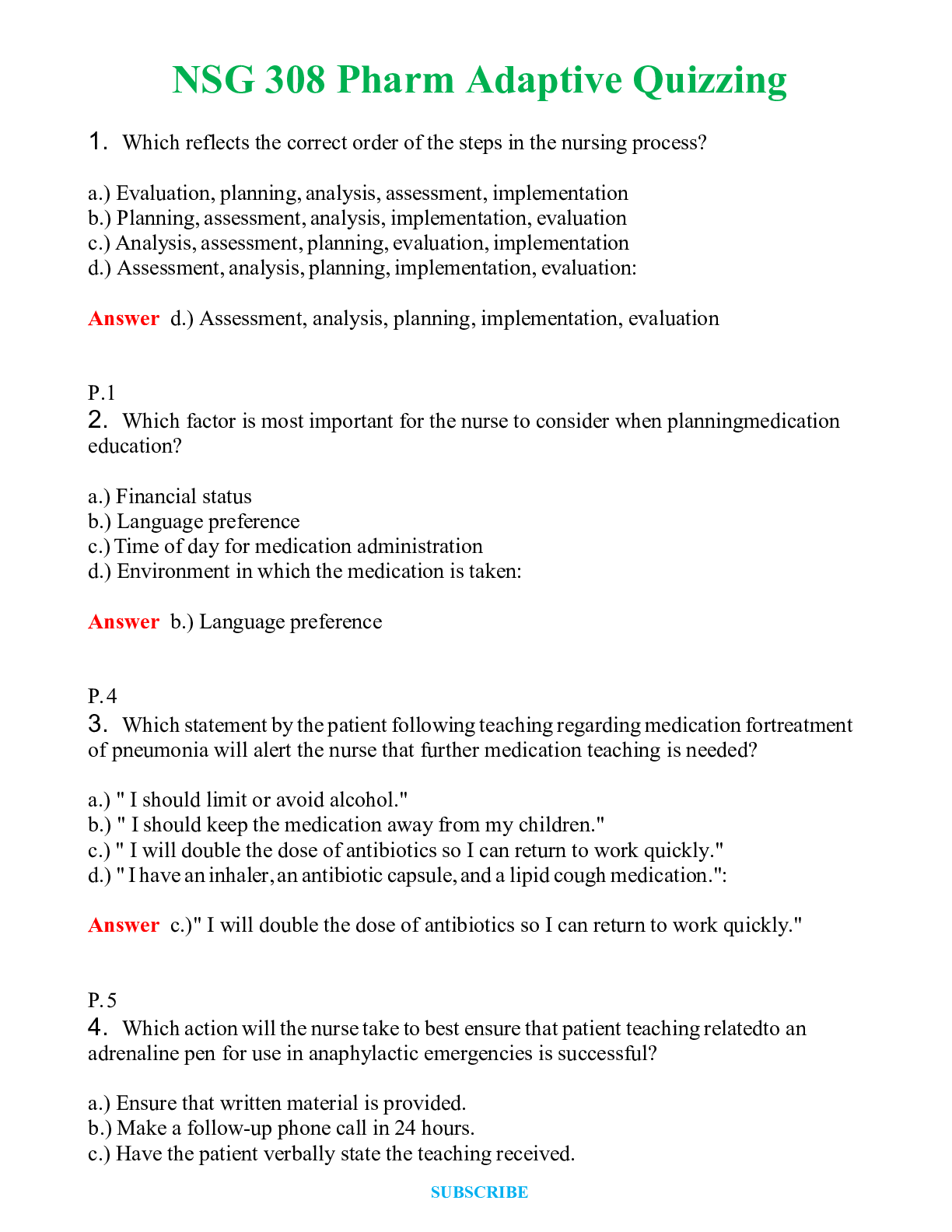 NSG 308 | Updated 2024 | Pharm Adaptive Quizzing, Pharm Exam 2,3 New Full Questions and Answers ( Included ) 100% Correct BUNDLE