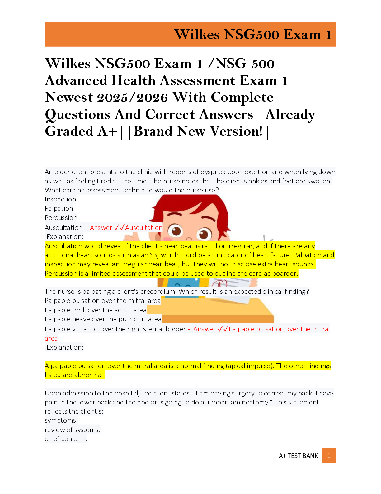 Wilkes NSG500 Exam 1 /NSG 500 Advanced Health Assessment Exam 1 Newest 2025/2026 With Complete Questions And Correct Answers |Already Graded A+||Brand New Version!|