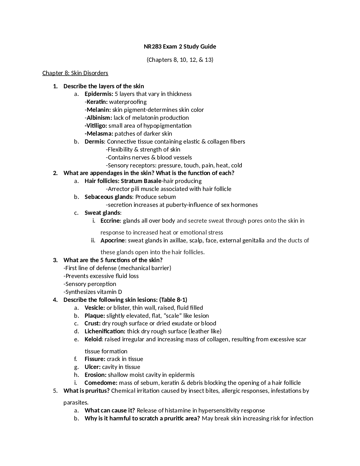 NR 283 STUDY GUIDES FOR EXAM 2 (CHAPTERS 8, 10, 12 & 13), EXAM 3 AND FINAL EXAM -CHAMBERLAIN COLLEGE OF NURSING