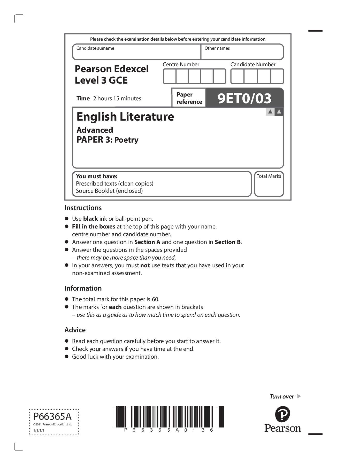 Pearson Edexcel_English Literature_9ET0/03 Question Paper_2021 | PAPER 3: Poetry Pearson Edexcel GCE_English Literature_9ET0/03 Mark Scheme_2021 | PAPER 3: Poetry