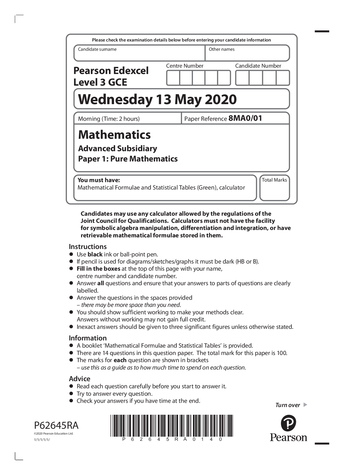 Pearson Edexcel Level 3 GCE_Chemistry_8CH0/01_Question Paper_Nov 2021 | PAPER 1: Core Inorganic and Physical Chemistry Pearson Edexcel GCE_Chemistry_8CH0/01_Mark Scheme_Nov 2021 | Paper 1: Core Inorg...