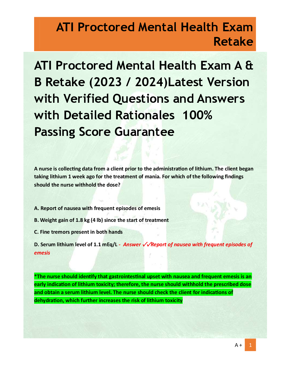 ATI Proctored Mental Health Exam A & B Retake (2023 / 2024)Latest Version with Verified Questions and Answers with Detailed Rationales 100% Passing Score Guarantee