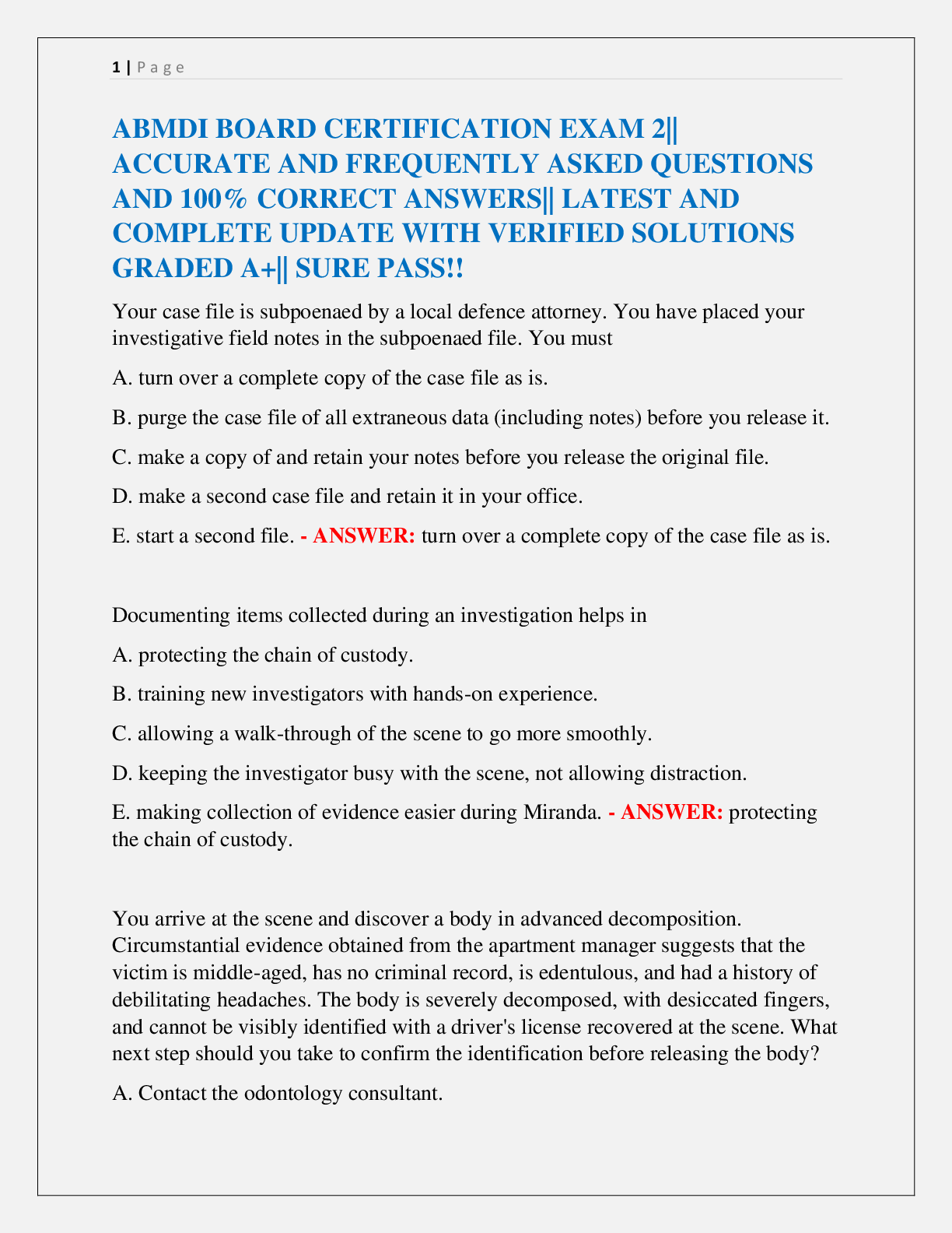 ABMDI BOARD CERTIFICATION EXAMS 1&2 PACKAGE|| ACCURATE AND FREQUENTLY ASKED QUESTIONS AND 100% CORRECT ANSWERS|| LATEST AND COMPLETE UPDATE WITH VERIFIED SOLUTIONS GRADED A+|| SURE PASS!!
