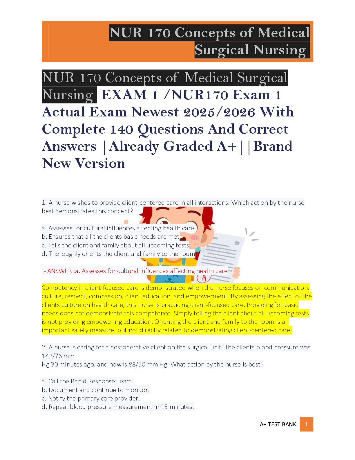 NUR 170 Concepts of Medical Surgical Nursing EXAM 1 /NUR170 Exam 1 Actual Exam Newest 2025/2026 With Complete 140 Questions And Correct Answers |Already Graded A+||Brand New Version