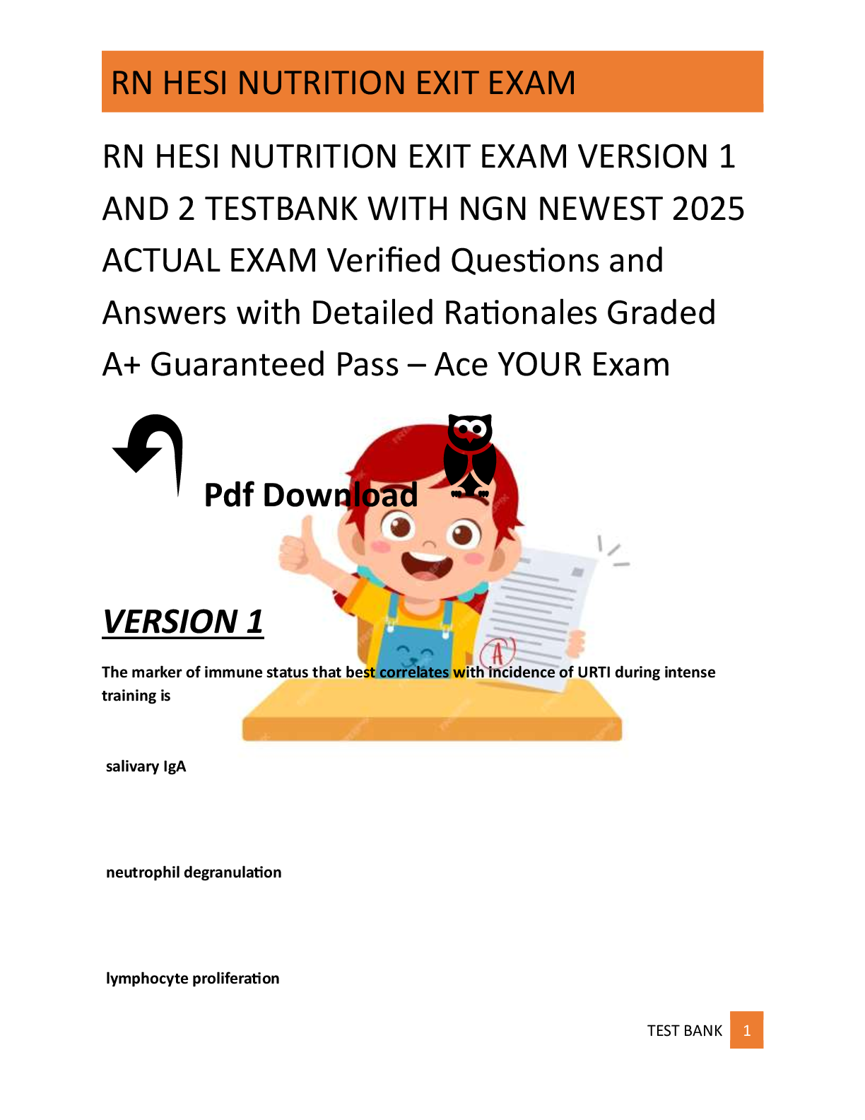 RN HESI NUTRITION EXIT EXAM VERSION 1 AND 2 AND TESTBANK WITH NGN NEWEST 2025 ACTUAL EXAM Verified uestions and Answers with Detailed Rationales Already Graded A+ Guaranteed Pass – Ace Exam