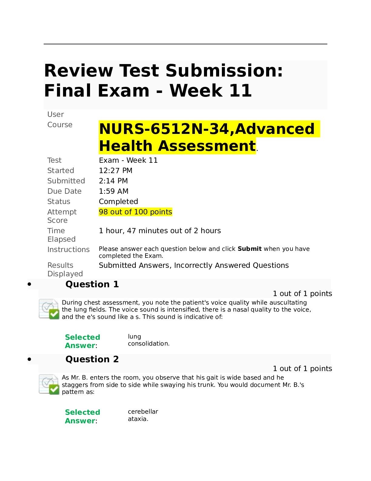 NURS-6512N-34,Advanced CourseHealth Assessment. NURS-6512N-8/NURS-6512C-8-Advanced Health Assessment2019 6512 Review Test Submission Final Exam Week 11 NURS 6512N Final Exam Updated 2022 NURS...