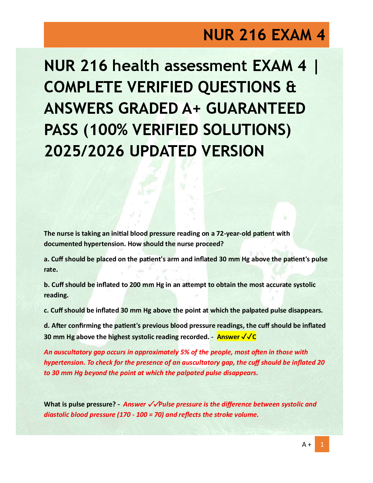 NUR 216 health assessment EXAM 4 | COMPLETE VERIFIED QUESTIONS & ANSWERS GRADED A+ GUARANTEED PASS (100% VERIFIED SOLUTIONS) 2025/2026 UPDATED VERSION