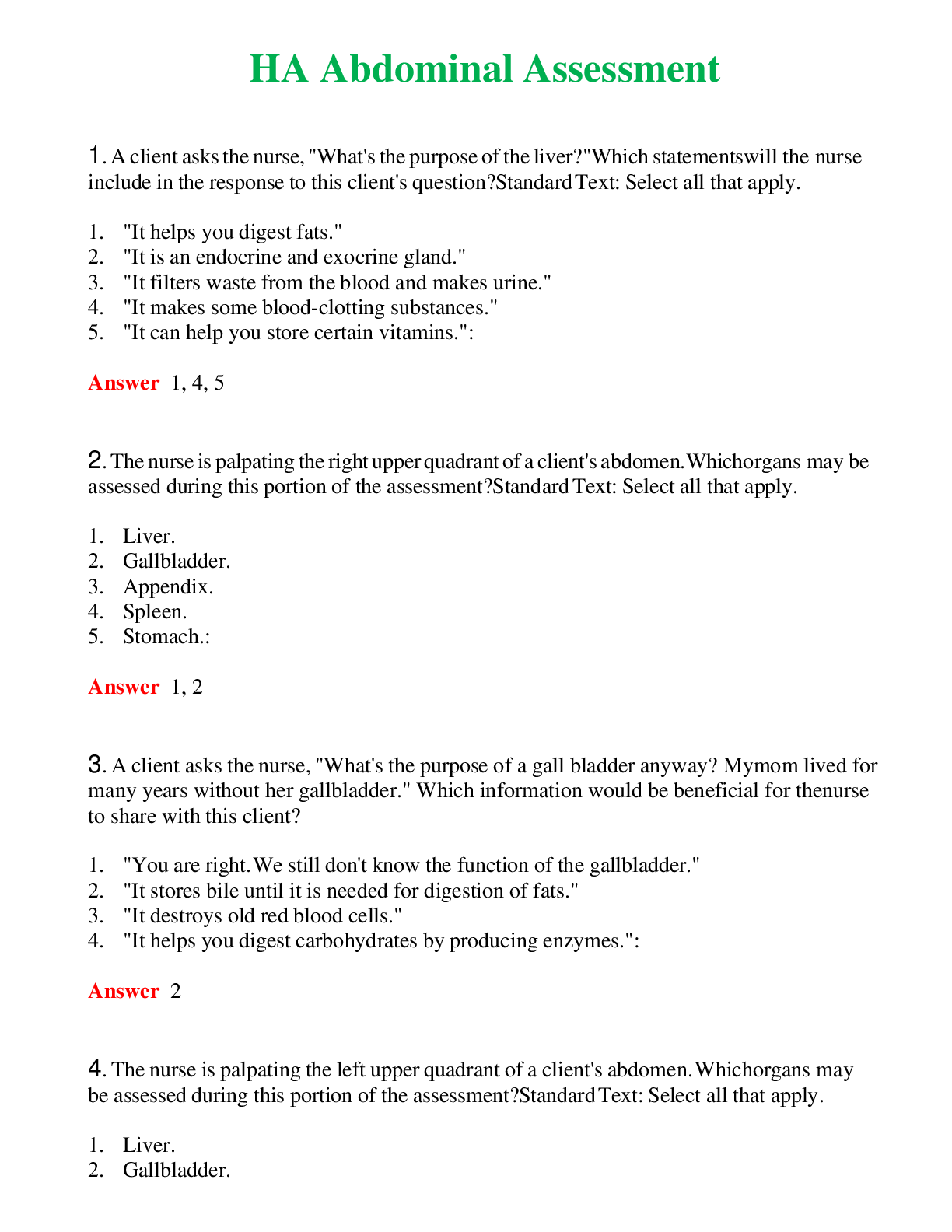 2024 BUNDLE HA ( Abdominal Assessment, Chapter 2,3,5,9,21,22, Communications, Exam , Head and Neck, MIDTERM, Quiz 9, TEST REVIEW QUESTIONS ) Passed | A+ Rated Guide | New Full Exam Actual