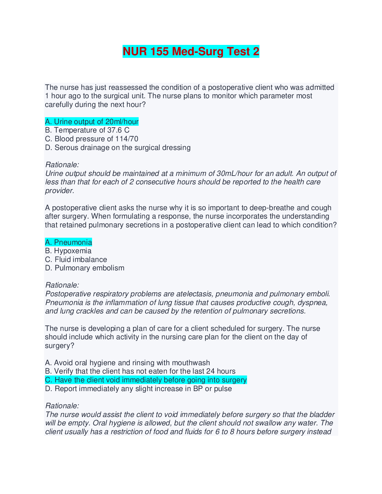 NUR 155 Test 2 - Answered with Rationales (Complete Solutions) The nurse has just reassessed the condition of a postoperative client who was admitted 1 hour ago to the surgical unit. The nurse plans...