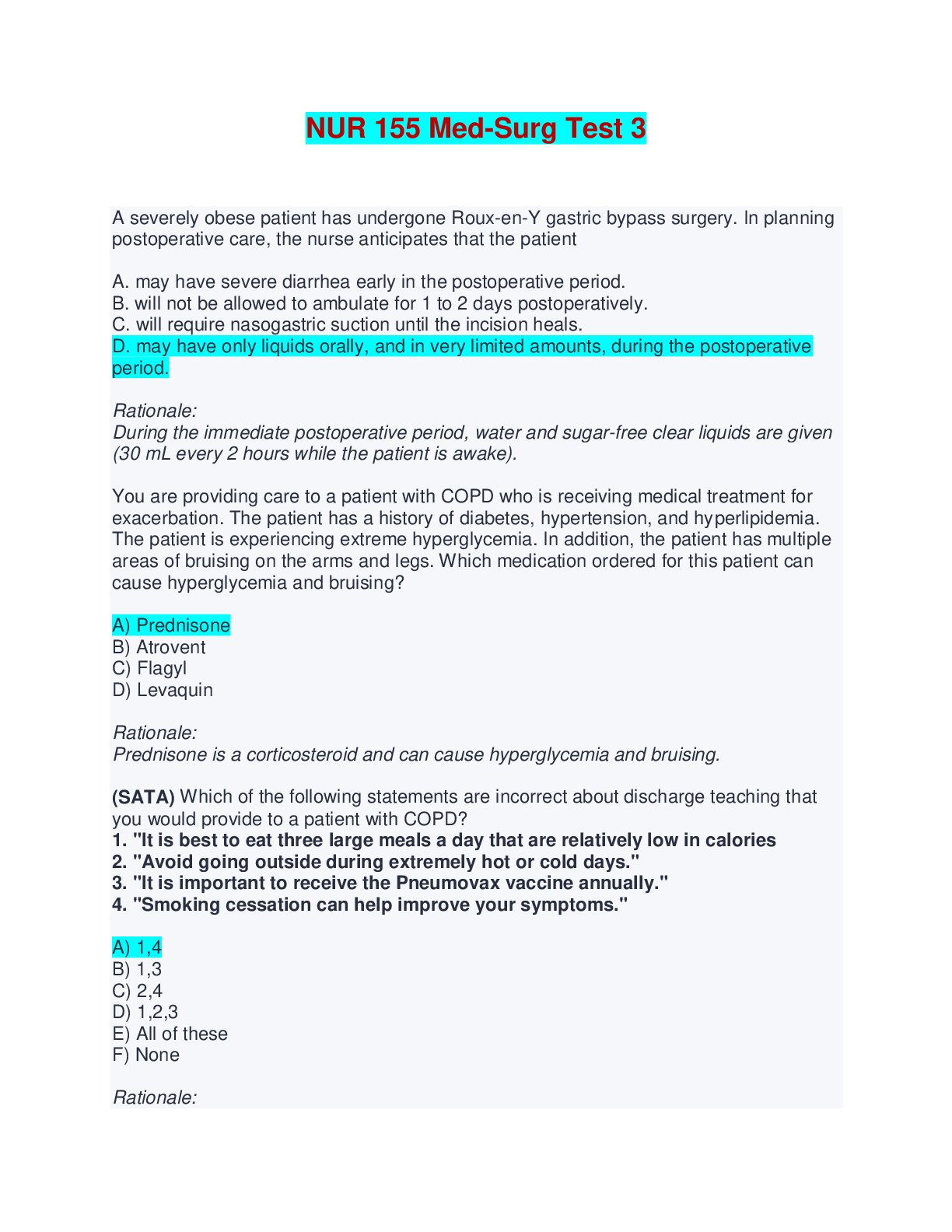 NUR 155 Test 3 - Answered with Rationales (Complete Solutions) A severely obese patient has undergone Roux-en-Y gastric bypass surgery. In planning postoperative care, the nurse anticipates that the...