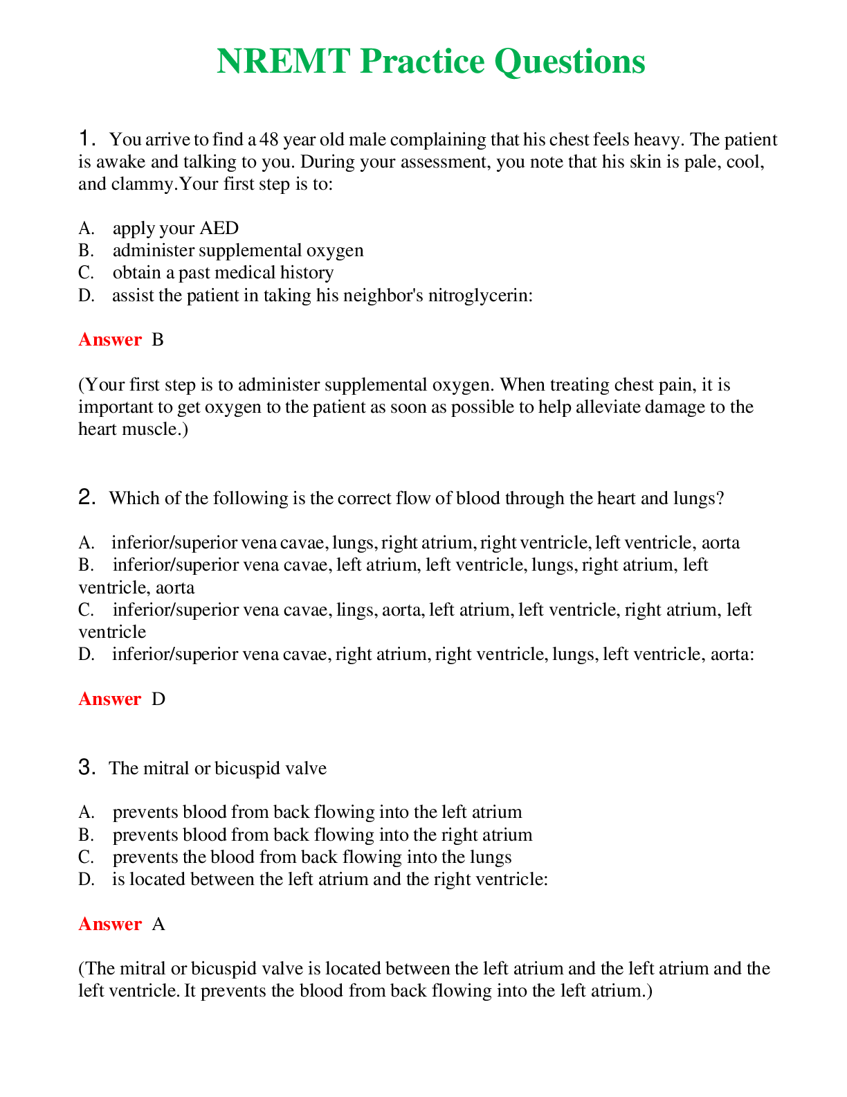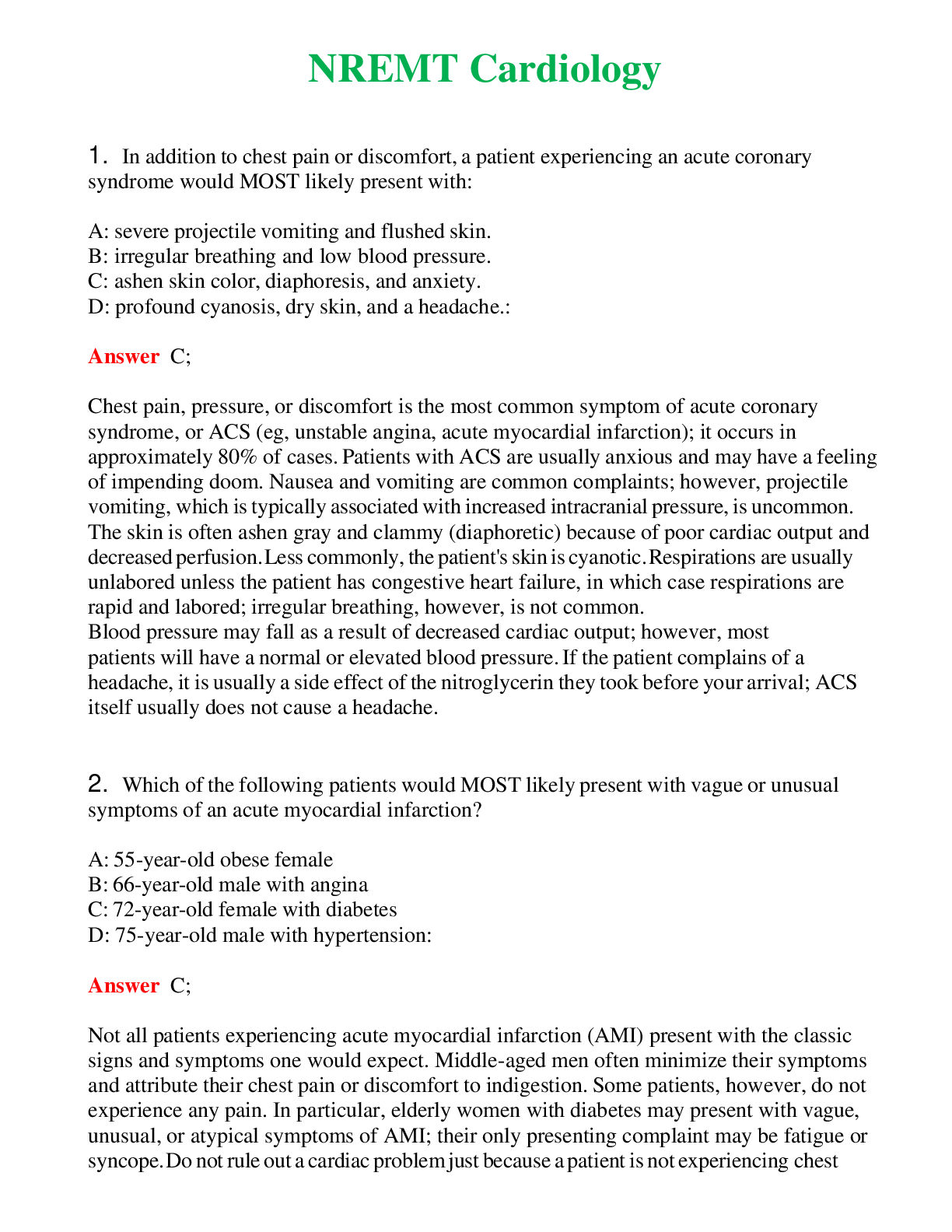 *NURSING> EXAM > NREMT Cardiology (Latest 2024) Questions With Complete Grade A+ Answers (All)