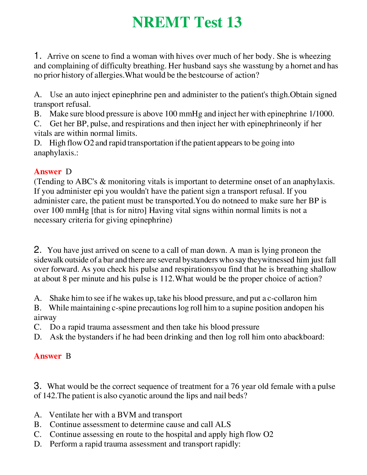 NREMT Test 13 (Latest 2024) Questions With Complete Grade A+ Answers NREMT Test 13 (Latest 2024) Questions With Complete Grade A+ Answers