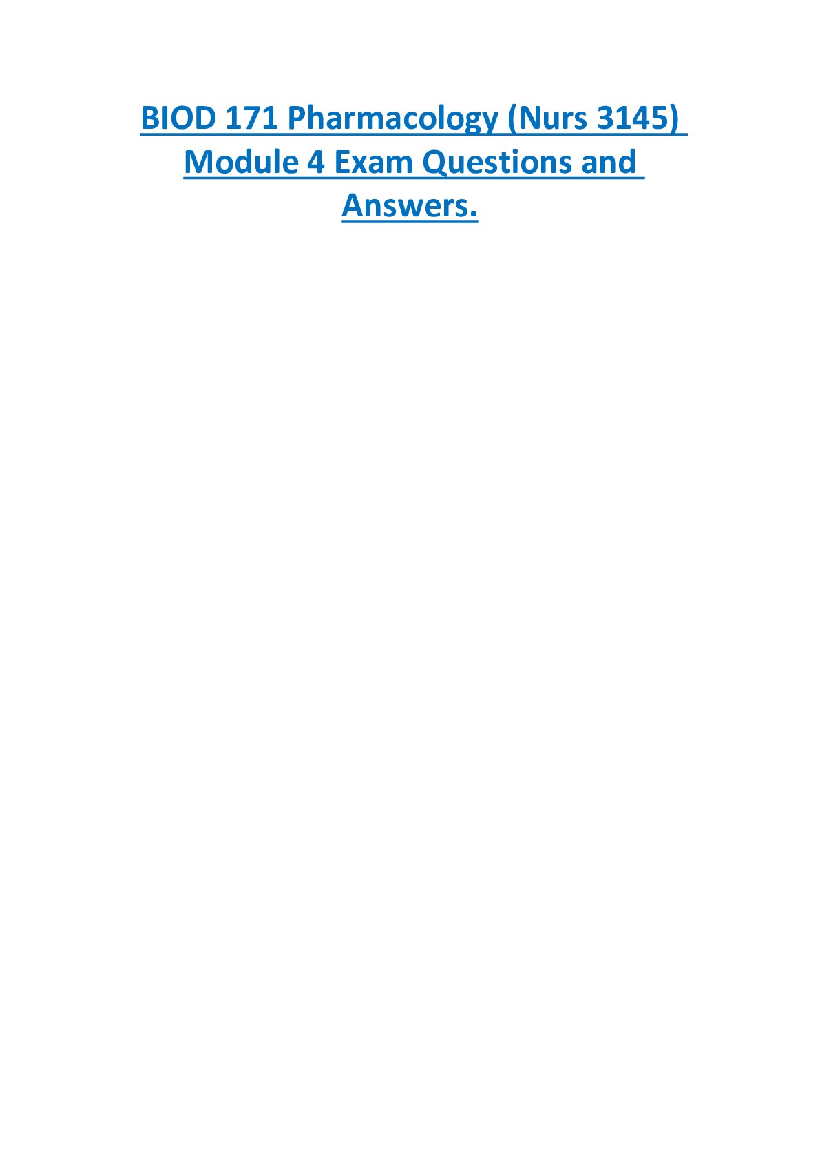 Biology> EXAM > BIOD 171 Pharmacology (Nurs 3145) Module 4 Exam Questions and Answers (All)