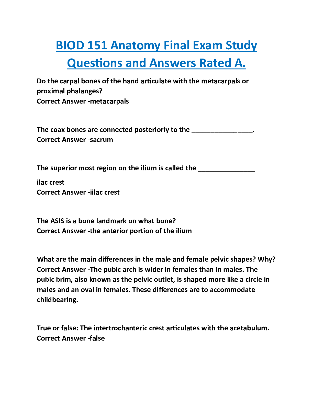BIOD 151 Anatomy Final Exam Study Questions and Answers Rated A.
