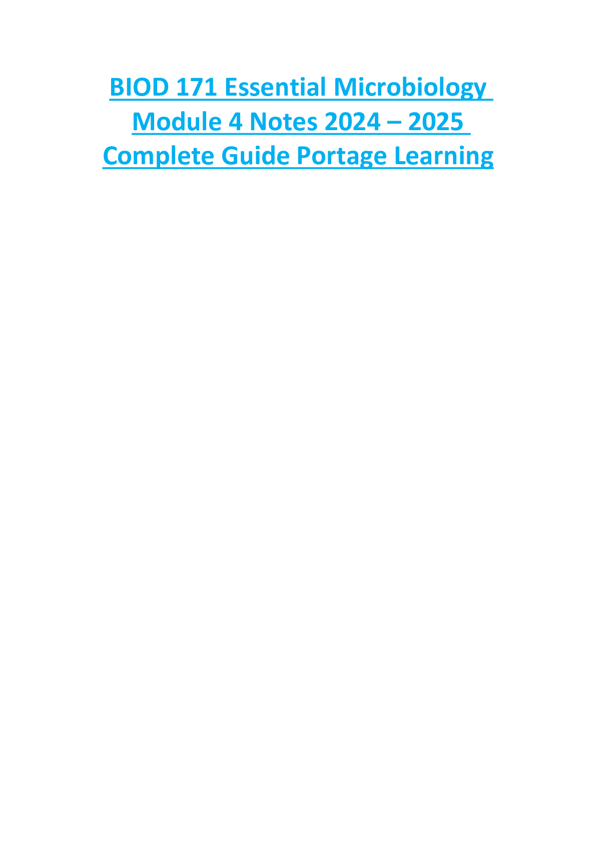COMBINED BIOL 171 ESSENTIAL MICROBIOLOGY LECTURES NOTES FOR MODULE 1-6 LATEST 2024 - 2025 EDITIONS WITH ALL INFORMATION YOU NEED TO PASS PORTAGE LEARNING.... [Show More]