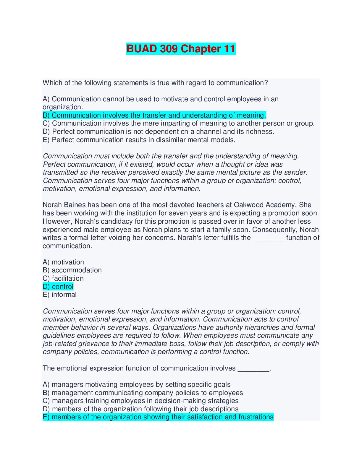 BUAD 309 Chapter 11 | Questions, Answers and Rationales Which of the following statements is true with regard to communication? A) Communication cannot be used to motivate and control employees in a...
