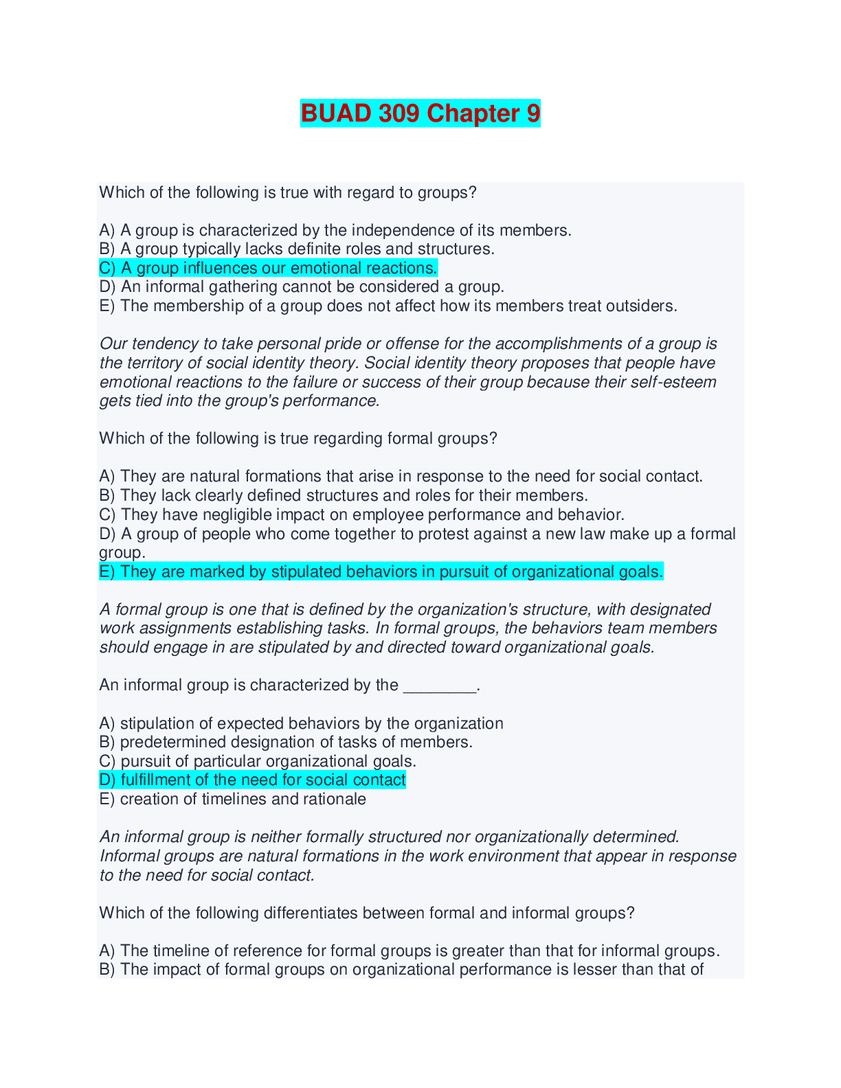 BUAD 309 Chapter 9 | Complete Solutions (Verified) Which of the following is true with regard to groups? A) A group is characterized by the independence of its members. B) A group typically lacks de...