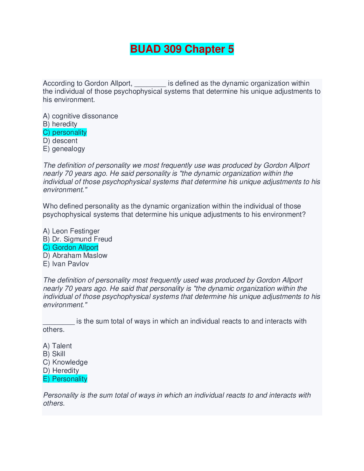 BUAD 309 Chapter 5 | Questions with complete solutions According to Gordon Allport, ________ is defined as the dynamic organization within the individual of those psychophysical systems that determi...
