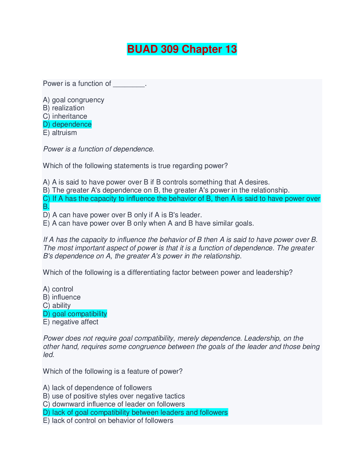 BUAD 309 Chapter 13 | Answered with Rationales (Complete Solutions) Power is a function of ________. A) goal congruency B) realization C) inheritance D) dependence E) altruism Power is a function of...