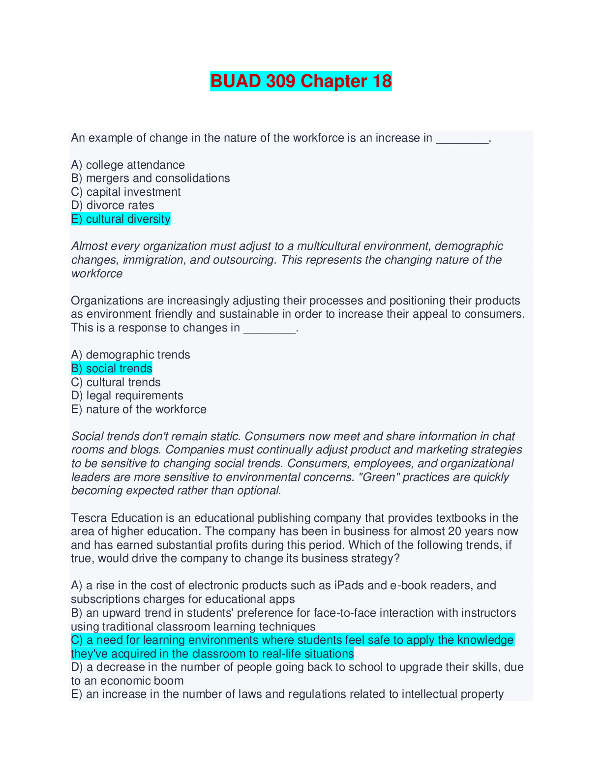 BUAD 309 Chapter 18 | Questions and Answers (Complete Solutions) An example of change in the nature of the workforce is an increase in ________. A) college attendance B) mergers and consolidations C...