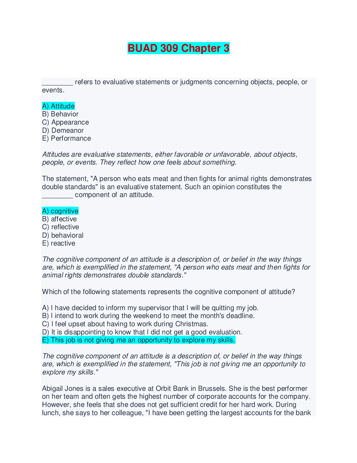 BUAD 309 Chapter 3 | Answered with Rationales ________ refers to evaluative statements or judgments concerning objects, people, or events. A) Attitude B) Behavior C) Appearance D) Demeanor E) Perfor...