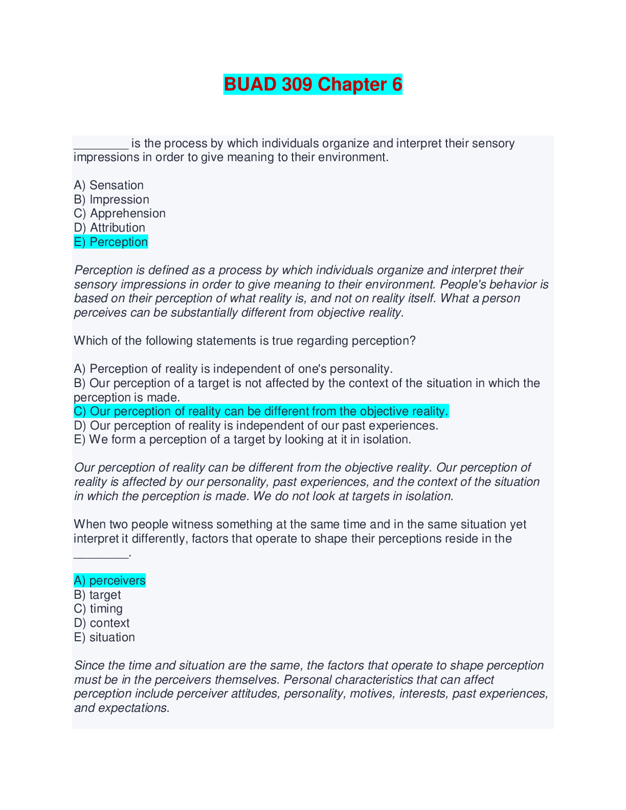 BUAD 309 Chapter 6 | Answered with Rationales (Complete Solutions) ________ is the process by which individuals organize and interpret their sensory impressions in order to give meaning to their env...
