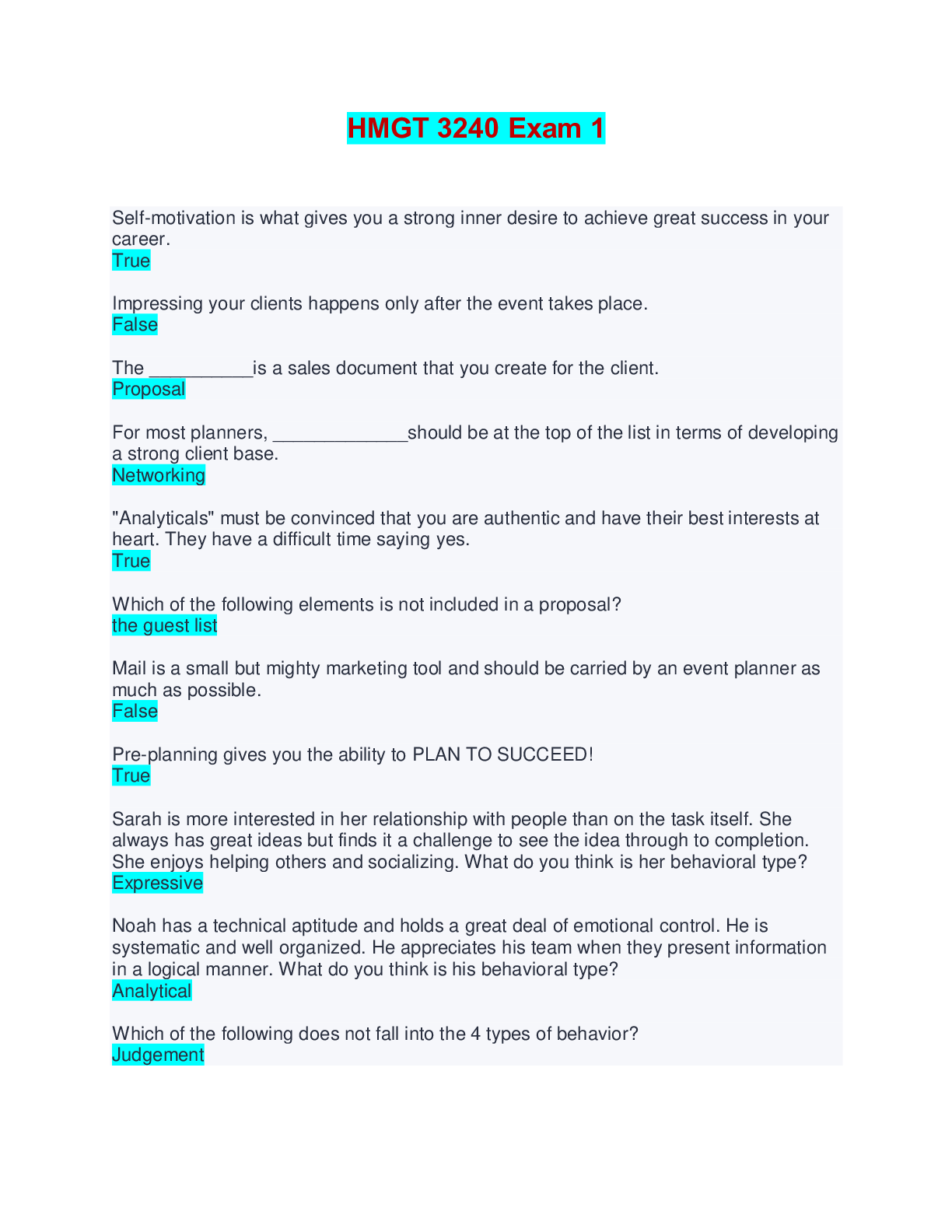 HMGT 3240 Exam 1 | Questions with Verified Answers Self-motivation is what gives you a strong inner desire to achieve great success in your career. True Impressing your clients happens only after th...