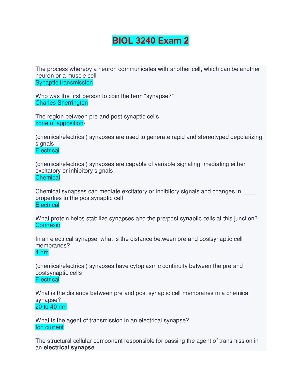 BIOL 3240 Exam 2 | Complete Solutions (Verified) The process whereby a neuron communicates with another cell, which can be another neuron or a muscle cell Synaptic transmission Who was the first per...