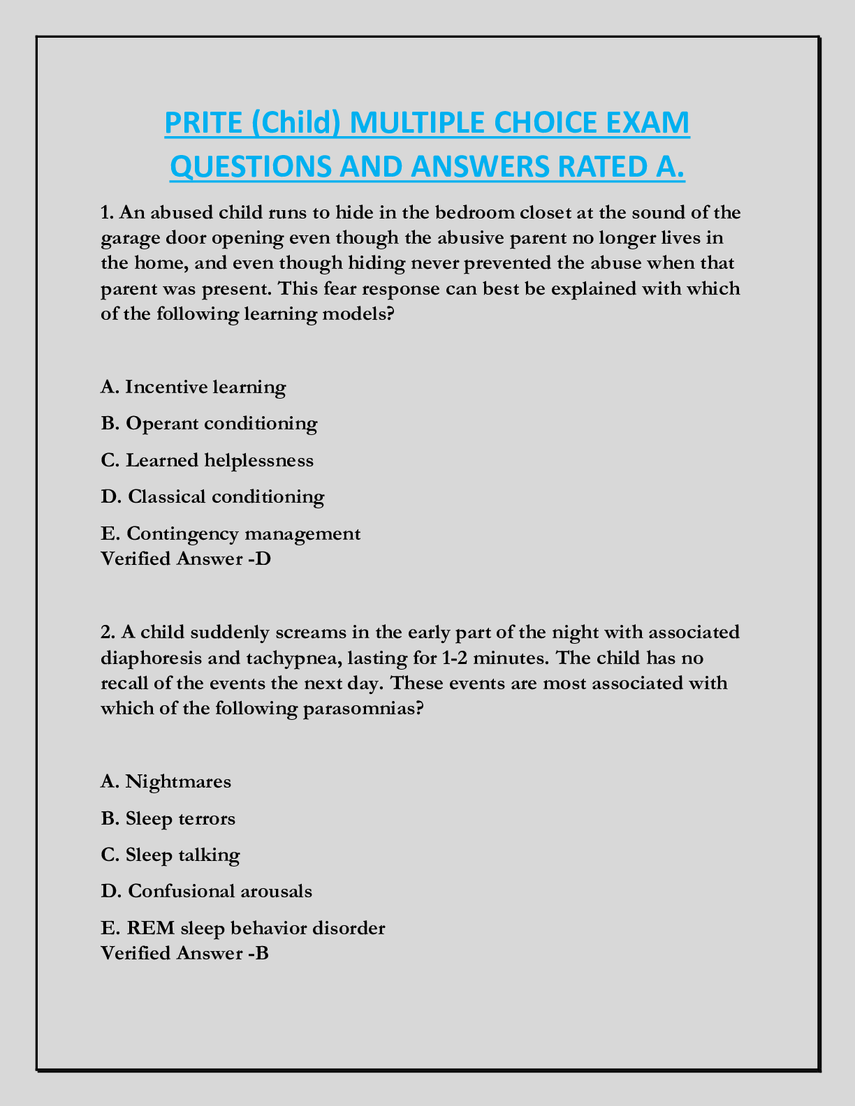 PRITE (Child) MULTIPLE CHOICE EXAM QUESTIONS AND ANSWERS RATED A.
