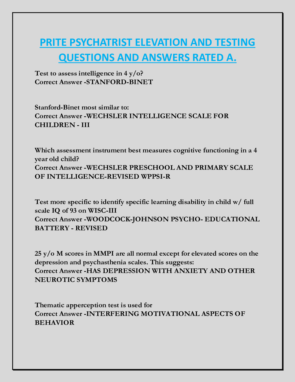 PRITE PSYCHATRIST ELEVATION AND TESTING QUESTIONS AND ANSWERS RATED A.