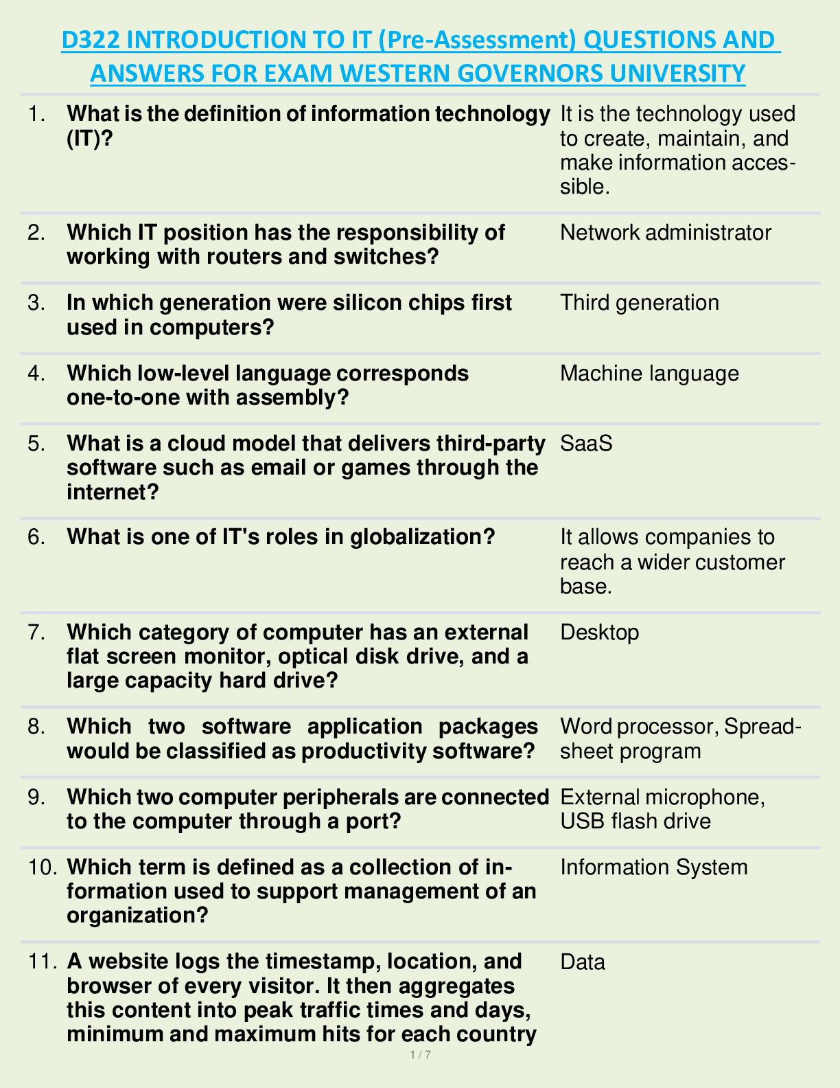 Information Technology> EXAM > D322 INTRODUCTION TO IT (Pre-Assessment) QUESTIONS AND ANSWERS FOR EXAM WESTERN GOVERNORS UNIVERSITY (All)