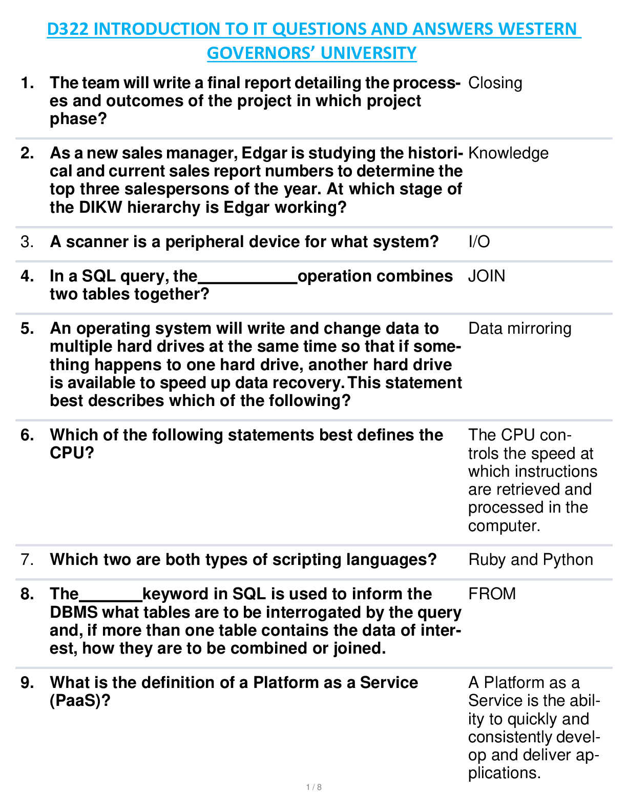 D322 INTRODUCTION TO IT QUESTIONS AND ANSWERS WESTERN GOVERNORS’ UNIVERSITY