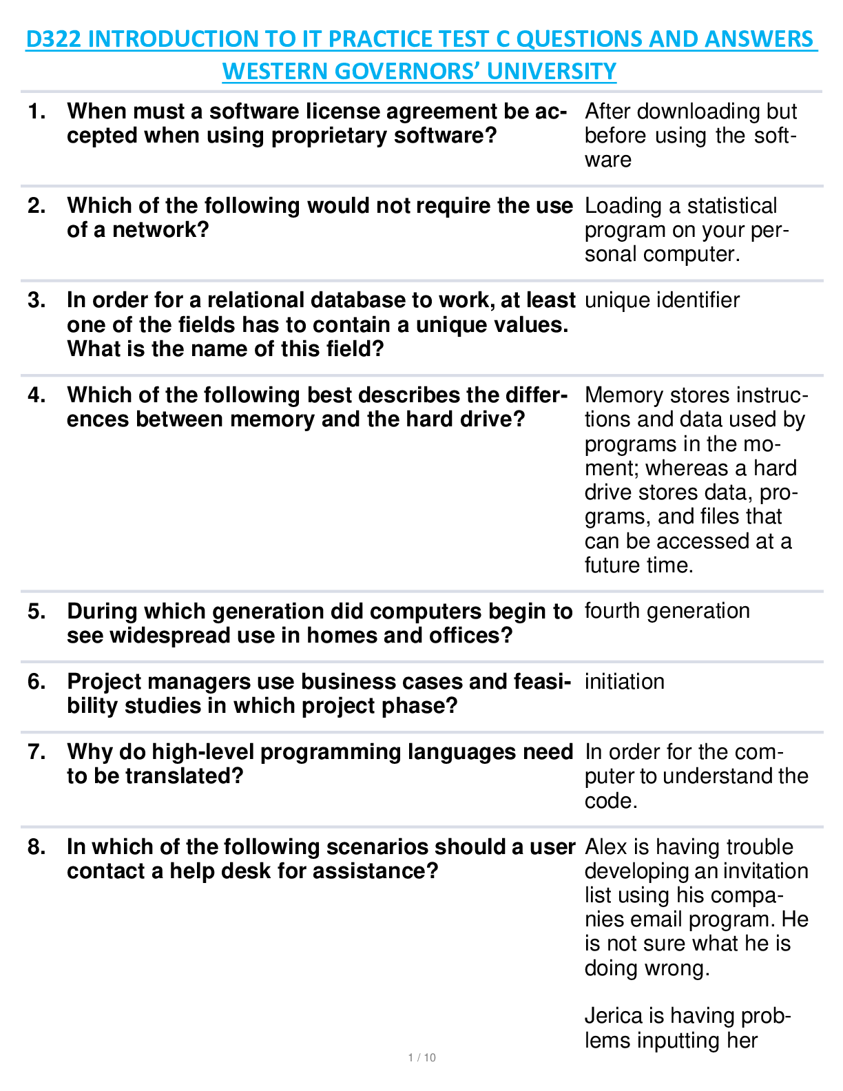 D322 INTRODUCTION TO IT PRACTICE TEST C QUESTIONS AND ANSWERS WESTERN GOVERNORS’ UNIVERSITY