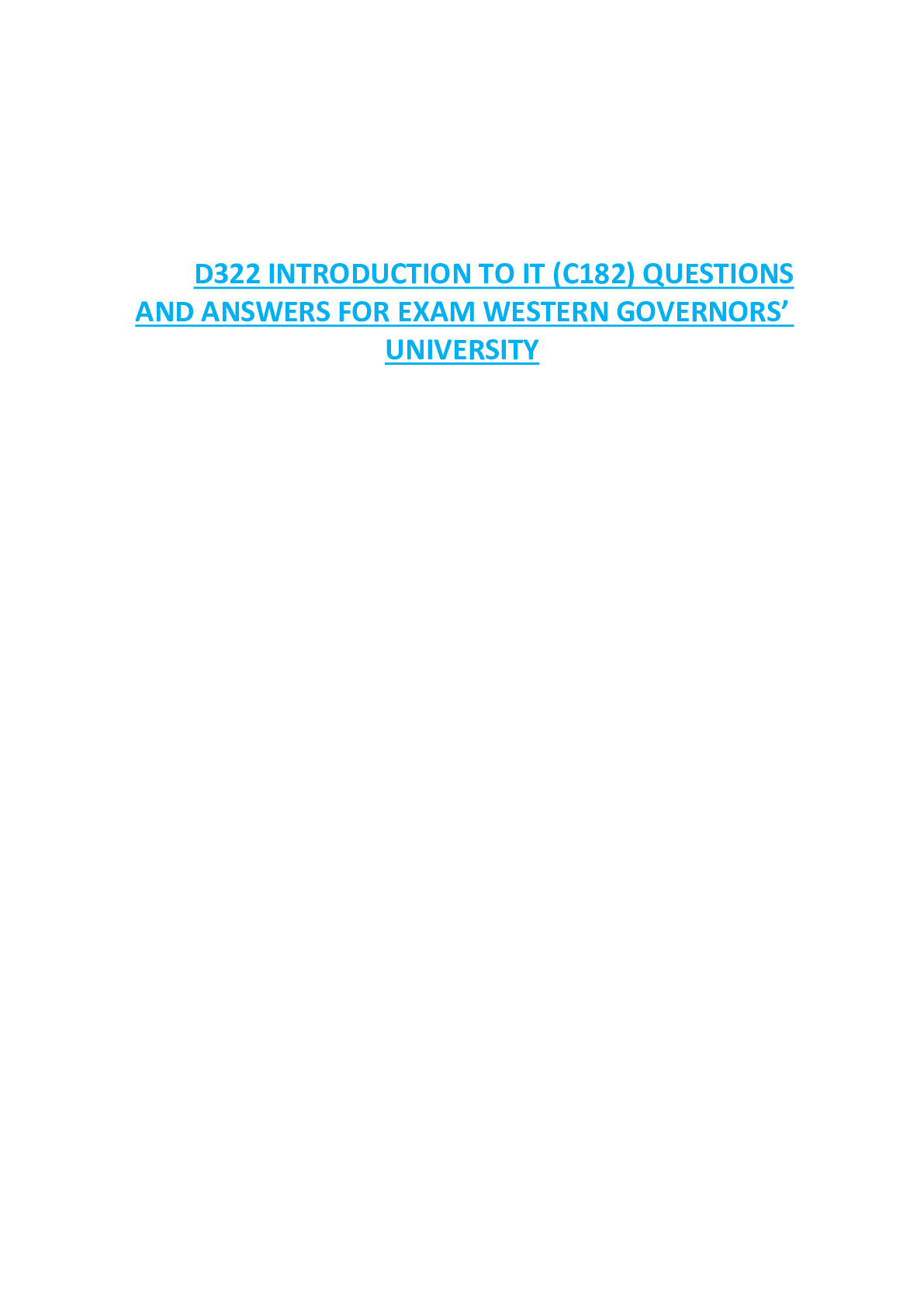 D322 INTRODUCTION TO IT (C182) QUESTIONS AND ANSWERS FOR EXAM WESTERN GOVERNORS’ UNIVERSITY
