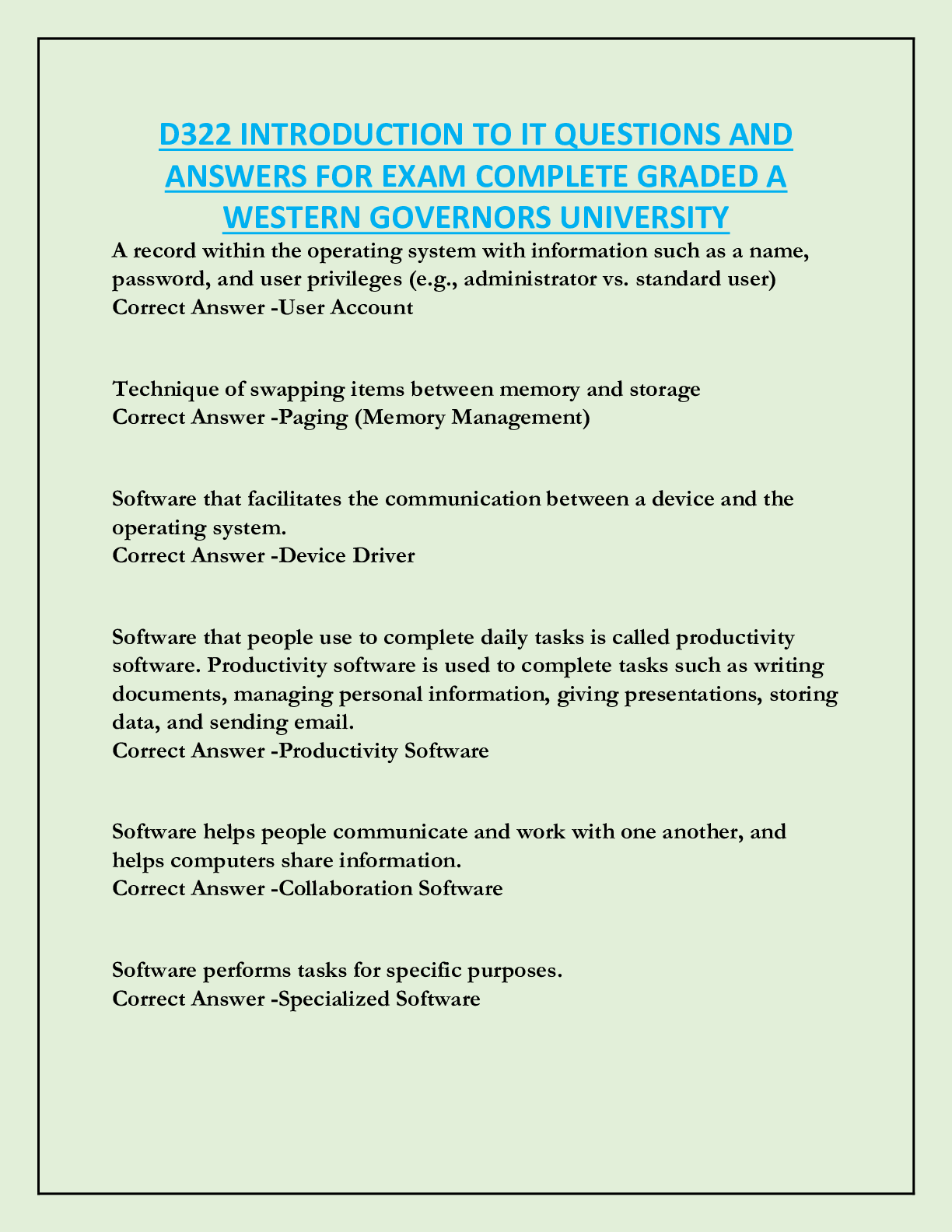 D322 INTRODUCTION TO IT QUESTIONS AND ANSWERS FOR EXAM COMPLETE GRADED A WESTERN GOVERNORS UNIVERSITY