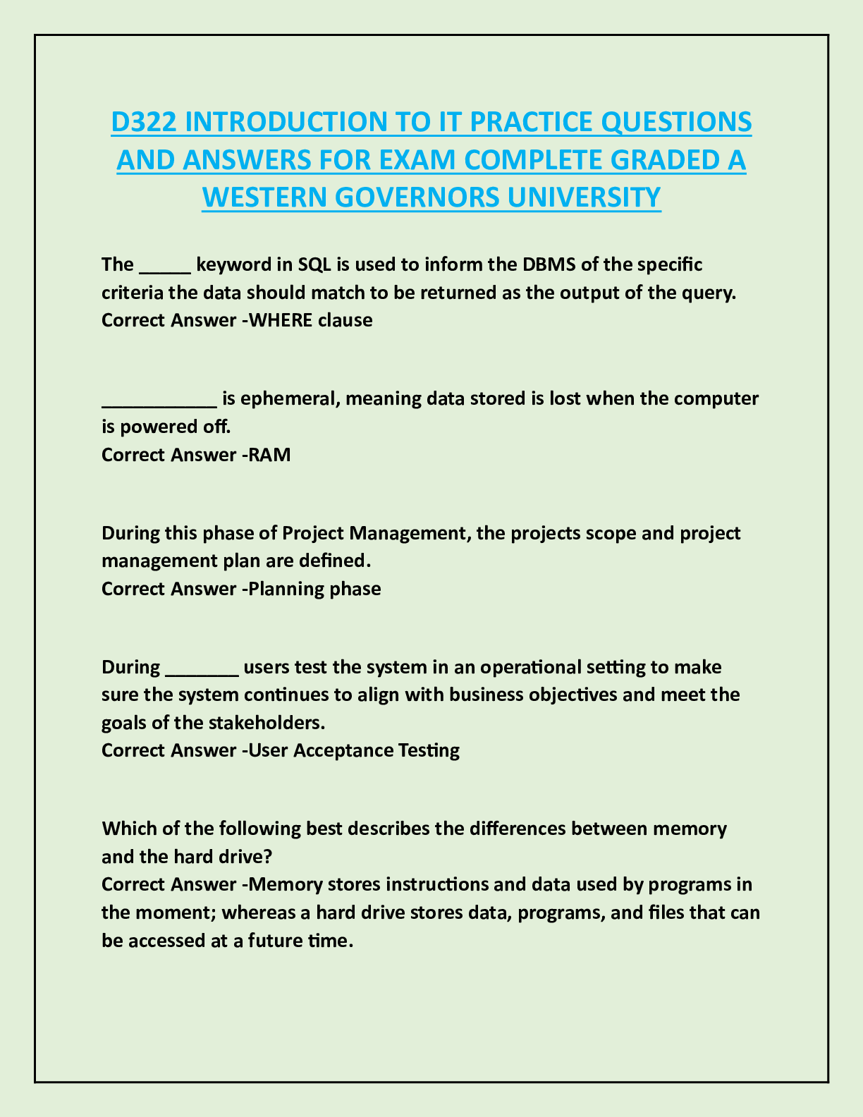 D322 INTRODUCTION TO IT PRACTICE QUESTIONS AND ANSWERS FOR EXAM COMPLETE GRADED A WESTERN GOVERNORS UNIVERSITY