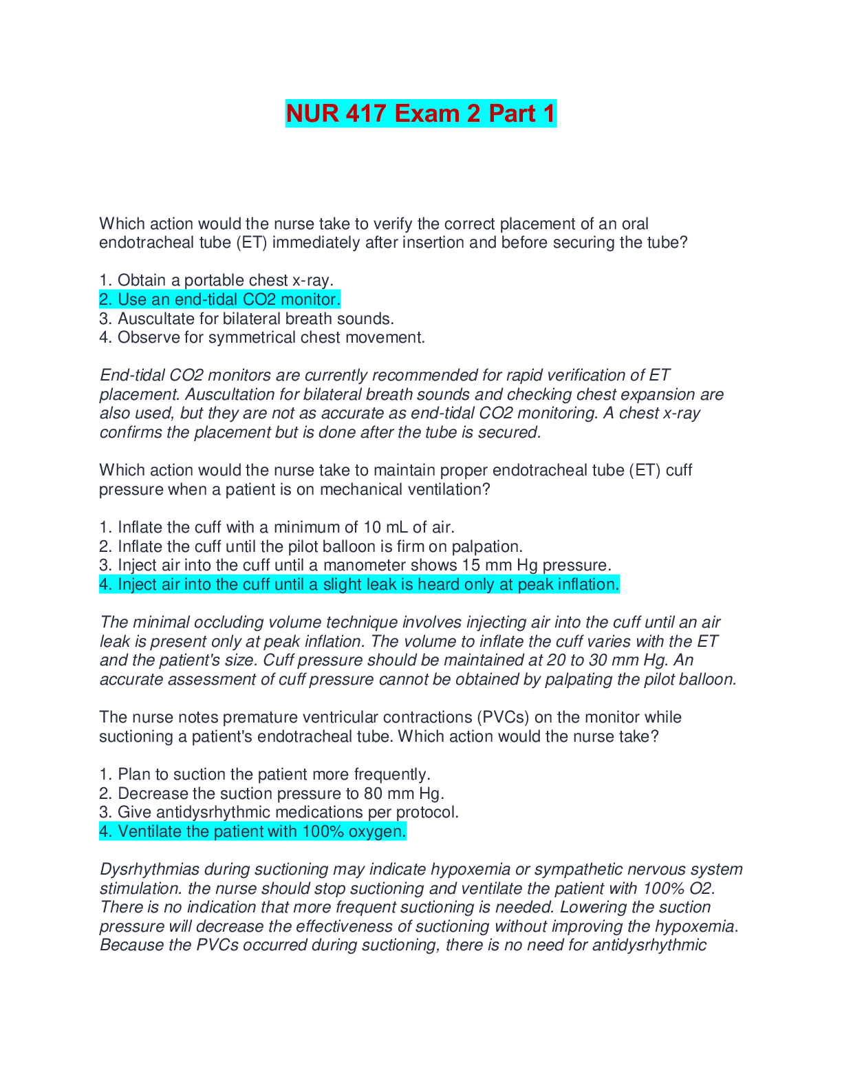 NUR 417 Exam 2 Part 1 | Questions, Answers and Rationales Which action would the nurse take to verify the correct placement of an oral endotracheal tube (ET) immediately after insertion and before...