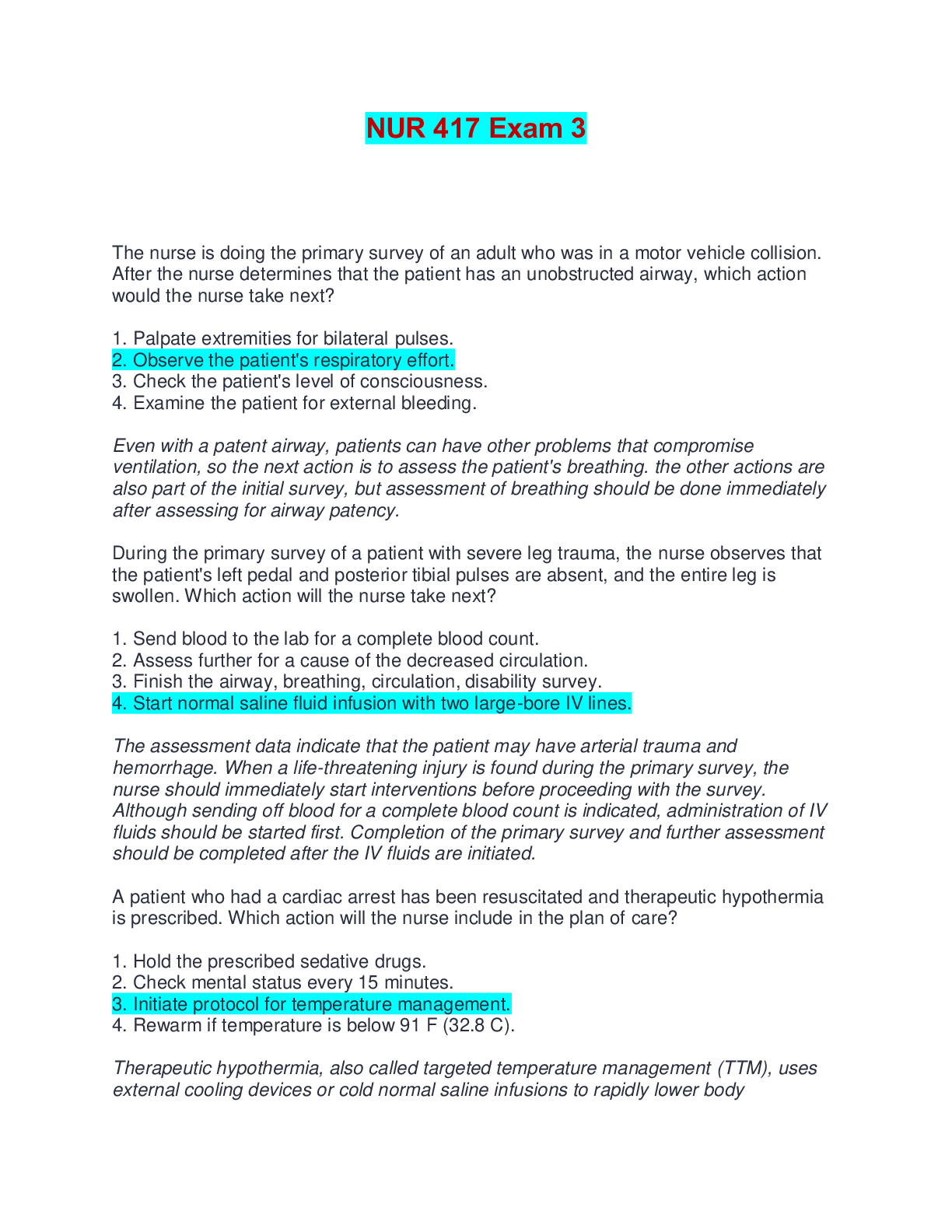 NUR 417 Exam 3 | Answered with Rationales (Complete Solutions) The nurse is doing the primary survey of an adult who was in a motor vehicle collision. After the nurse determines that the patient ha...