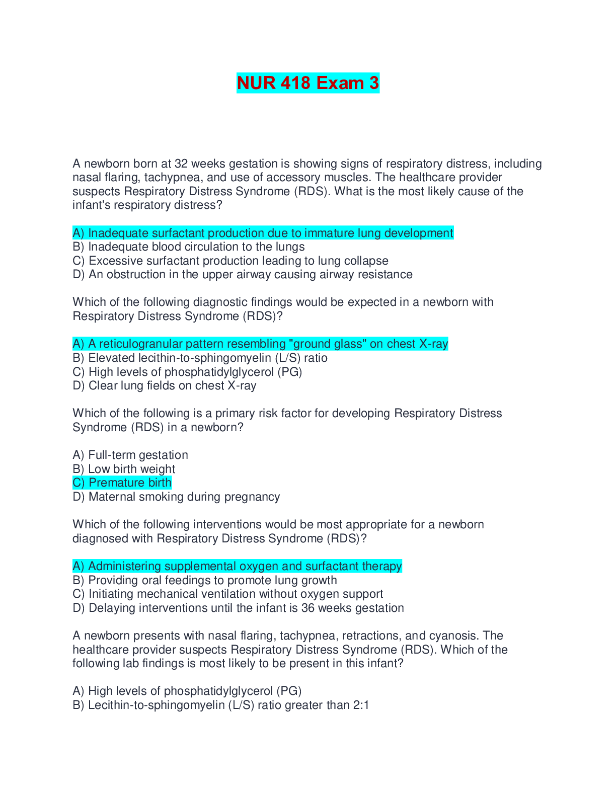 NUR 418 Exam 3 | Verified with 100% Correct Answers A newborn born at 32 weeks gestation is showing signs of respiratory distress, including nasal flaring, tachypnea, and use of accessory muscles....