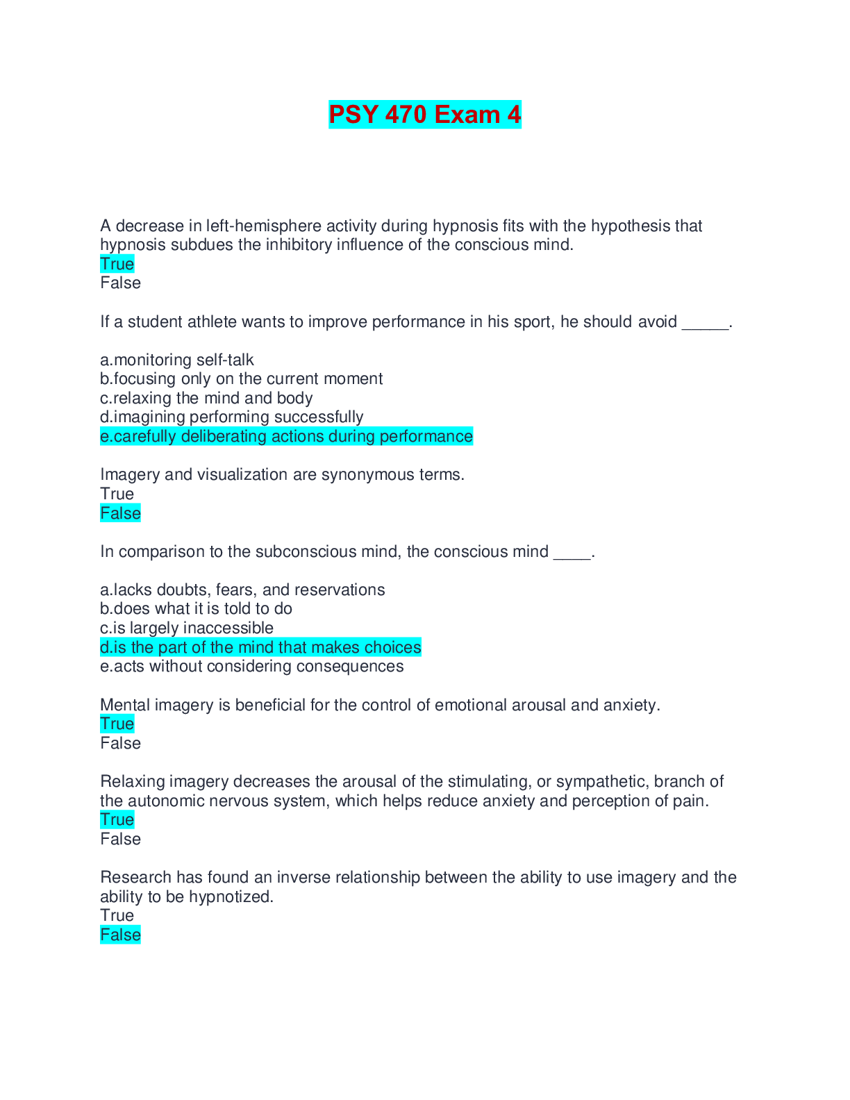 PSY 470 Exam 4 | Questions and Answers A decrease in left-hemisphere activity during hypnosis fits with the hypothesis that hypnosis subdues the inhibitory influence of the conscious mind. True Fal...