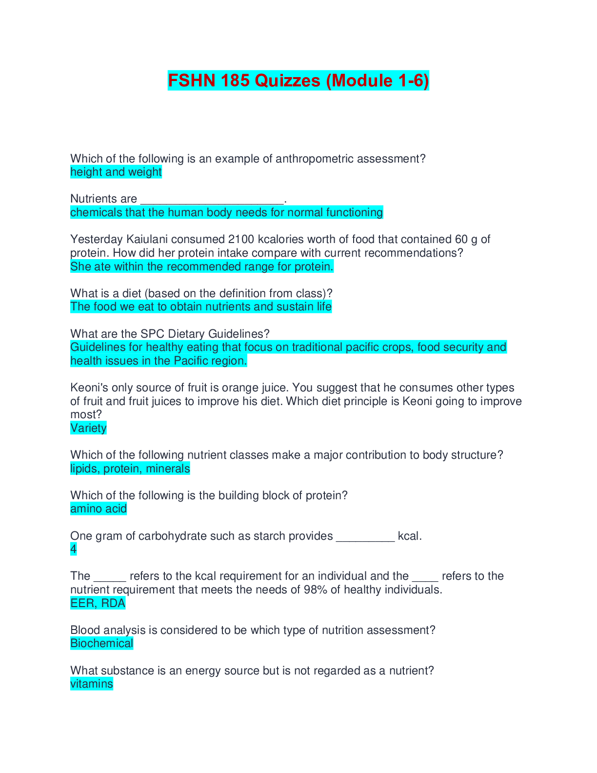 Nutrition> EXAM > FSHN 185 Quizzes (Module 1-6) | Questions with Verified Answers (All)