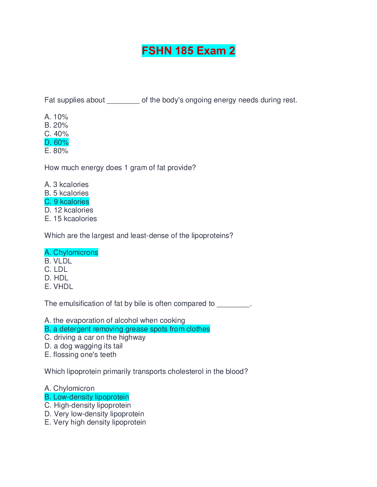 FSHN 185 Exam 2 | Questions with 100% Correct Answers Fat supplies about ________ of the body's ongoing energy needs during rest. A. 10% B. 20% C. 40% D. 60% E. 80% How much energy does 1 gram of f...