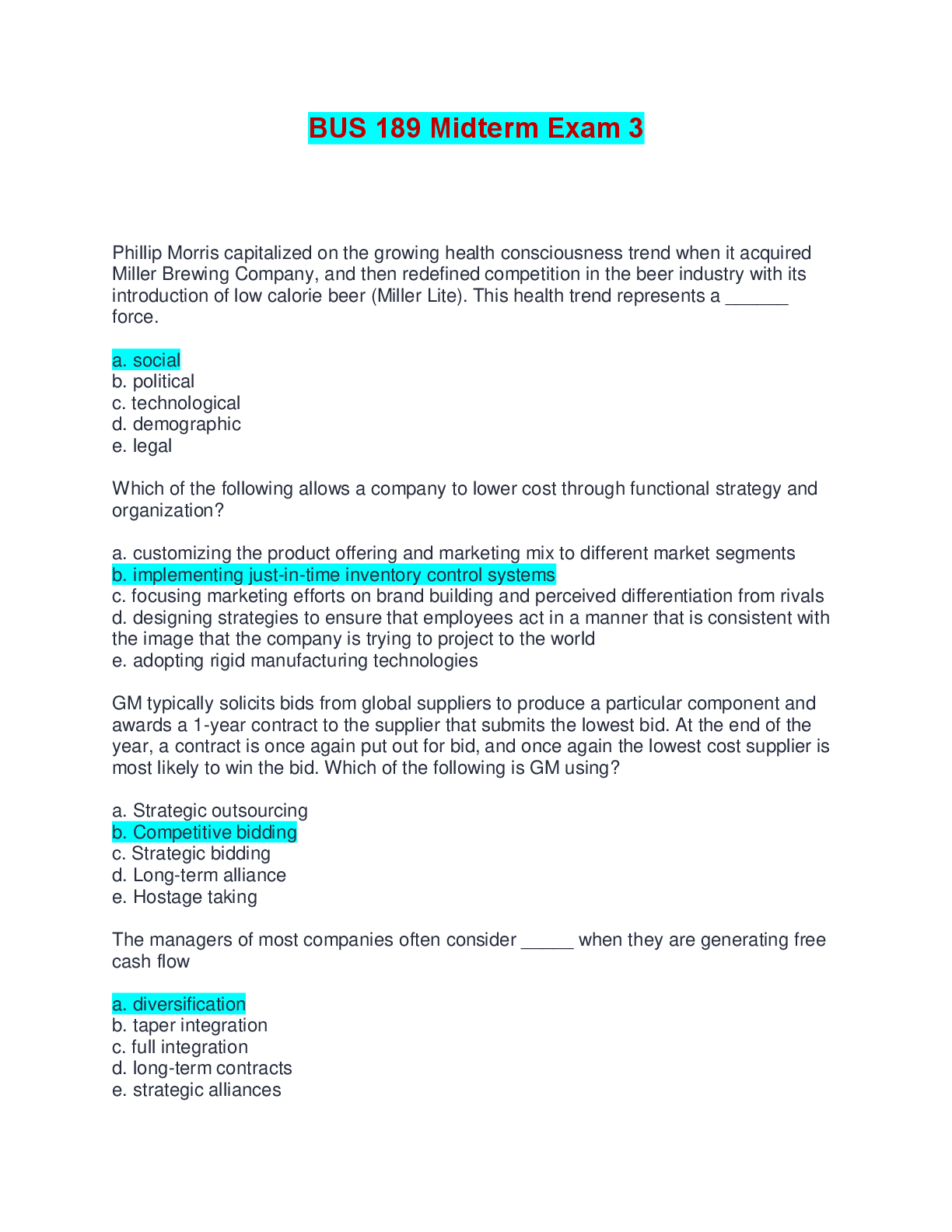 BUS 189 Midterm Exam 3 | Questions with complete solutions Phillip Morris capitalized on the growing health consciousness trend when it acquired Miller Brewing Company, and then redefined competiti...