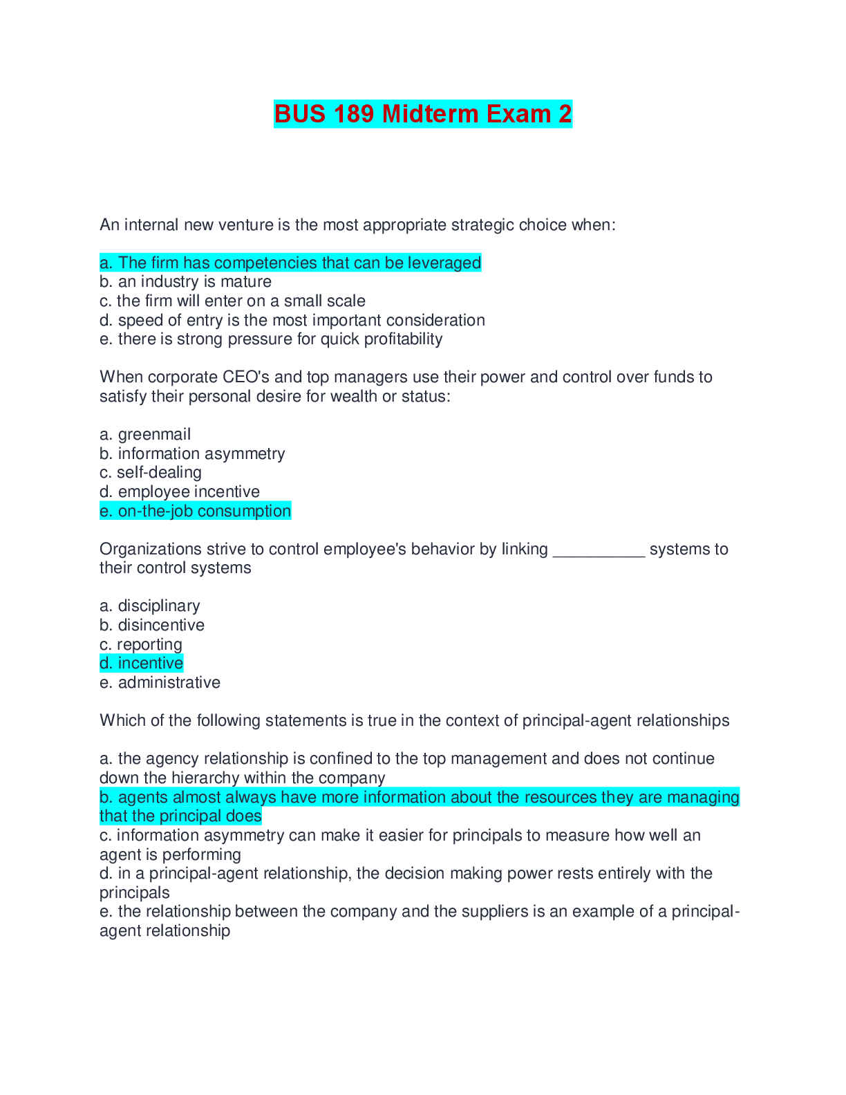 BUS 189 Midterm Exam 2 | Questions and Answers (Complete Solutions) An internal new venture is the most appropriate strategic choice when: a. The firm has competencies that can be leveraged b. an i...