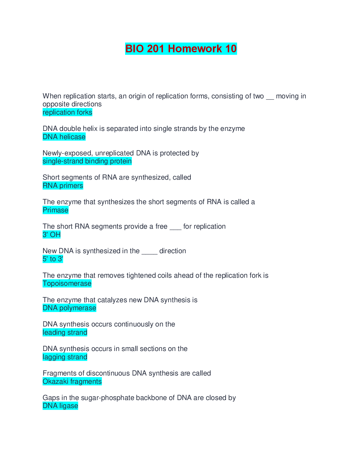 BIO 201 Homework 10 | Questions with 100% Correct Answers When replication starts, an origin of replication forms, consisting of two __ moving in opposite directions replication forks DNA double he...