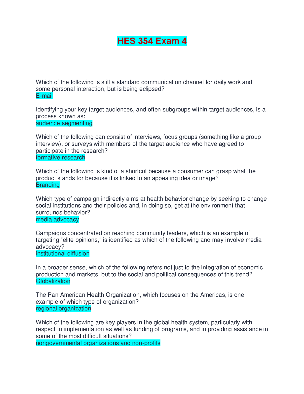 Health Care> EXAM > HES 354 Exam 4 | Questions and Answers (All)