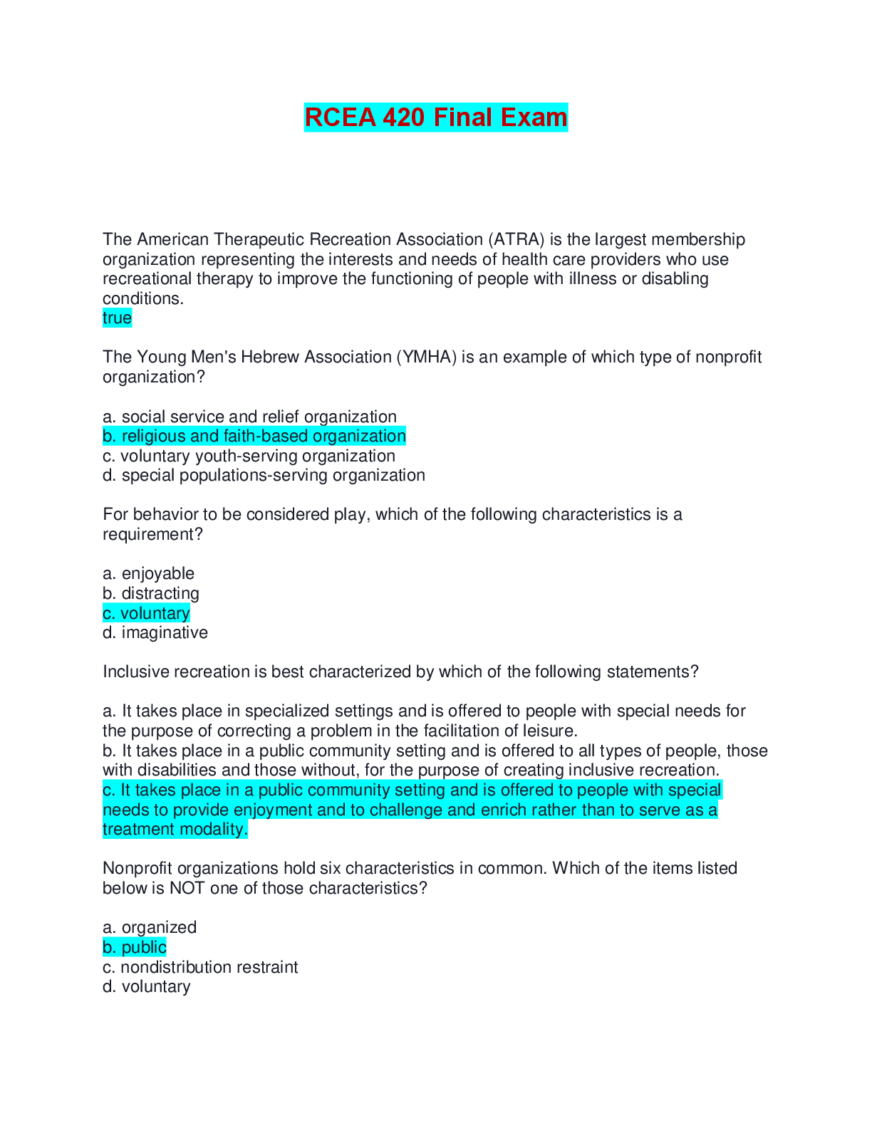 RCEA 420 Final Exam | Complete Solutions (Answered) The American Therapeutic Recreation Association (ATRA) is the largest membership organization representing the interests and needs of health care...