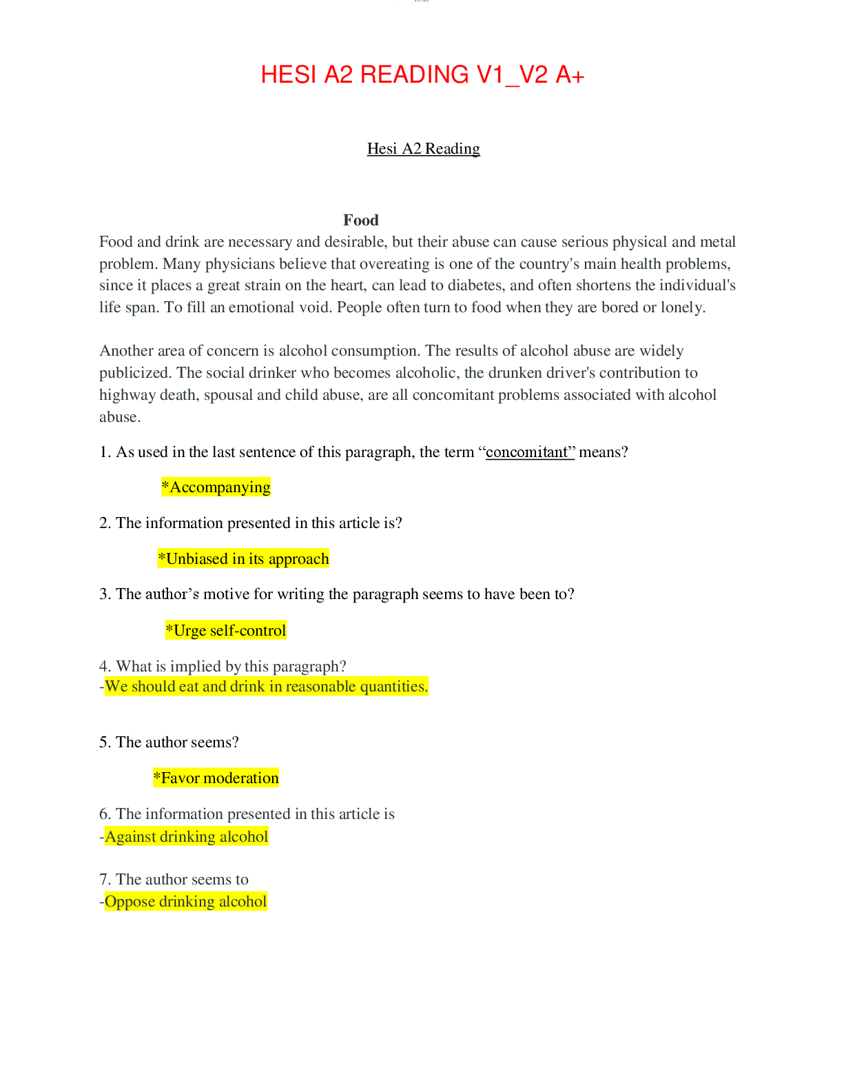 HESI A2 CRITICAL THINKING 2025-26 QUESTIONS AND UPDATED 100% CORRECT ANSWERS/ A GRADE Rationale HESI A2 CRITICAL THINKING 2025-26 QUESTIONS AND UPDATED 100% CORRECT ANSWERS/ A GRADE Rationale He... si A2 Entrance Exam (Hesi a2) Biology and Anatomy 2025-26 l BIOLOGY HESI A2 ENTRANCE EXAM 2025-26 Questions and answers with HESI VOCABULARY Hesi A2 Exam V1 with A+ Graded answers top rate document with perfect rationales HESI A2 VERSION 1 HESI A2 VOCABULARY LATEST HESI A2 READING COMPREHENSION 2025-26 LATEST EXAMS HESI A2 READING V1_V2 A+ [Show More]